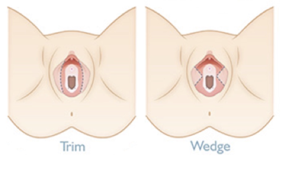 از این روش هنگامی استفاده می شود که لابیاهای فرد از حد طبیعی بزرگ تر باشد . این تکنیک توسط جراح زیبایی زنان استفاده می شود . در این روش پوست اضافی لابیا جدا می شود و در نتیجه لبه ها به یکدیگر نزدیک شده و بخیه زده می شوند . یکی از مزایایی که این روش دارد این است که قسمت صورتی تر کناره های لابیا در میان چین های لابیای بزرگ قرار گرفته است .